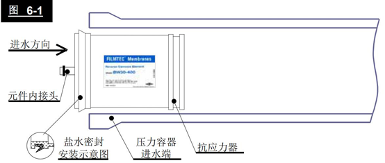 1)從包裝箱內小心取出膜元件,檢查元件上的鹽水密封圈位置和方向是否正確(鹽水密封圈開口方向必須面向進水方向,請參閱膜元件性能規(guī)范資料上的示意圖,如圖6-1所示)。